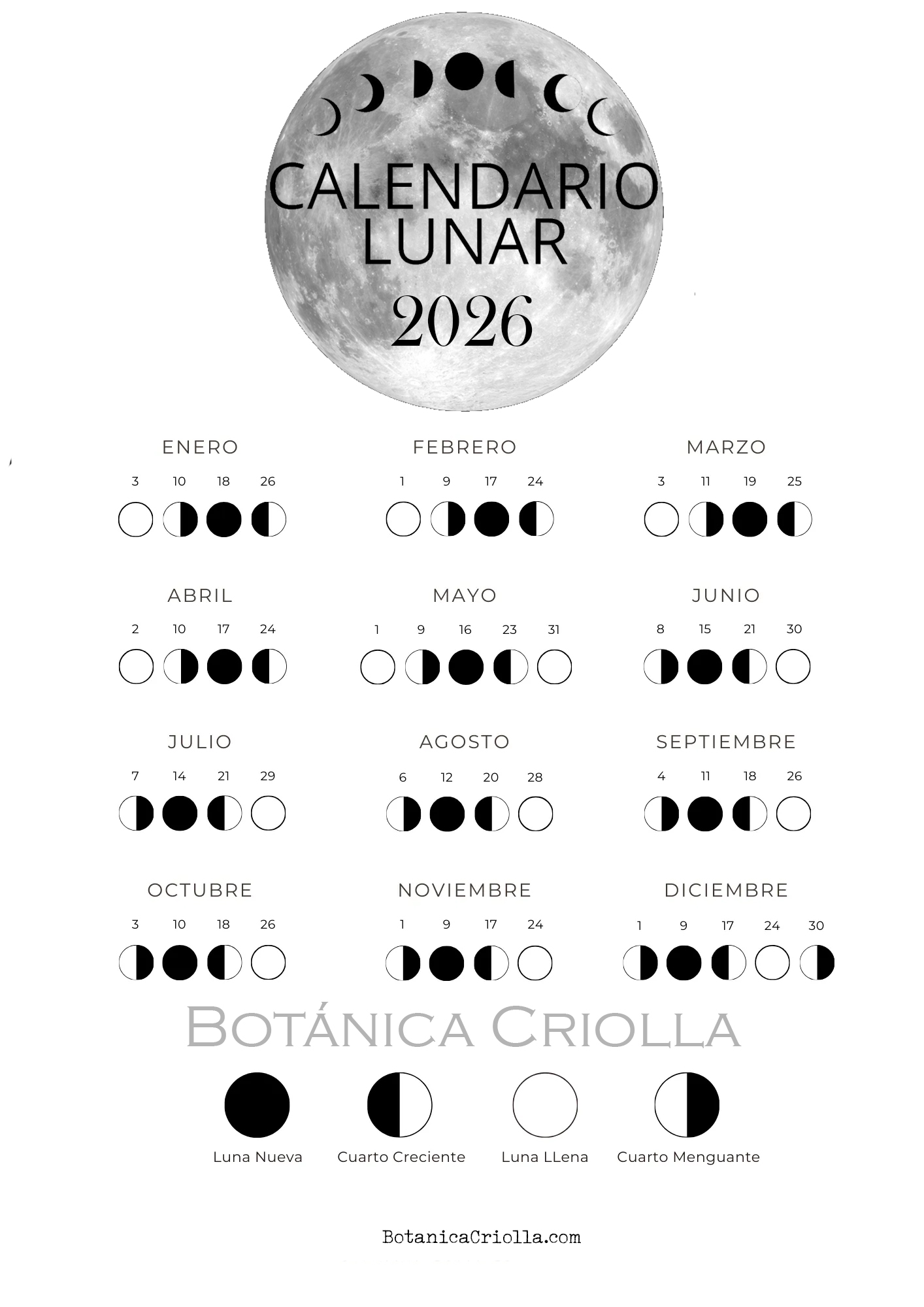 Descarga aquí un calendario lunar completo del 2026 para imprmir: